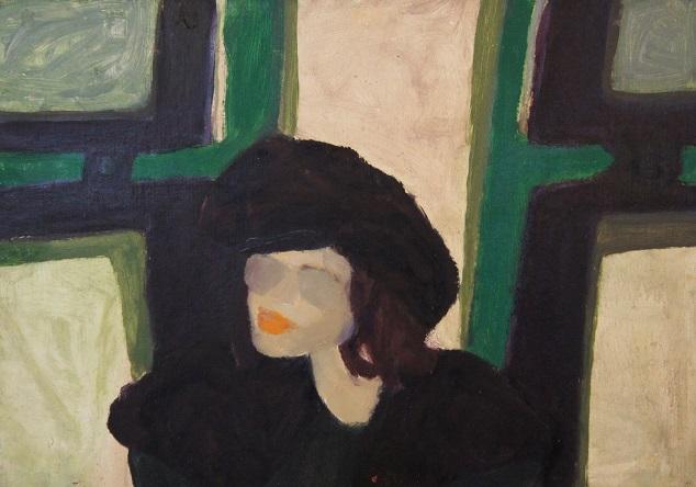 Из серии ОБЩЕСТВЕННЫЙ ТРАНСПОРТ. В электричке. Мобильник. 2016. Бумага, акрил, 62х86