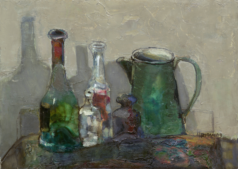 Натюрморт с бутылками. 2009. Бумага, масло. 33х46