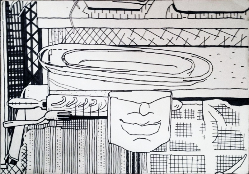 Натюрморт с Давидом и скалкой. 2015. Бумага, черный маркер, 60х85