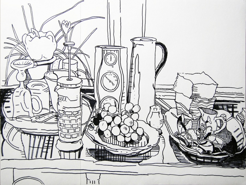 Натюрморт с этажеркой. 2016. Бумага, черный маркер, 47х60